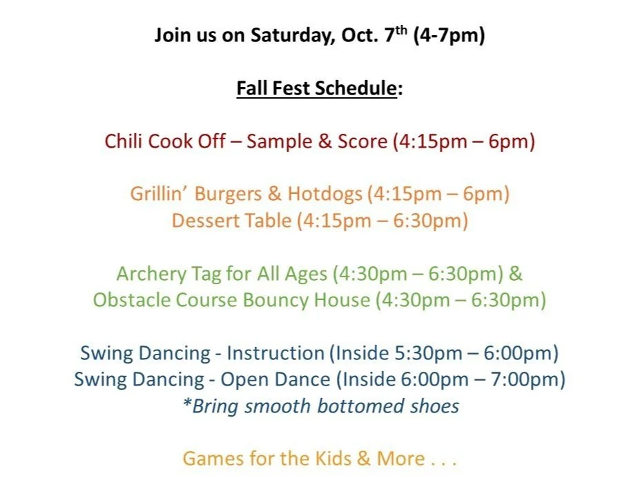 Fall Fest - October 5th (4pm - 7pm) Saturday, October 7, 2023 4:00 PM 7:00 PM 16:00 19:00 Red Cedar Church 550 W. Grand River Ave. Okemos, MI 48864 (map) Google Calendar ICS click here to find ways to volunteer for the fall fest SIGNUP FOR THE CHILI COOKOFF volunteer for the fall fest